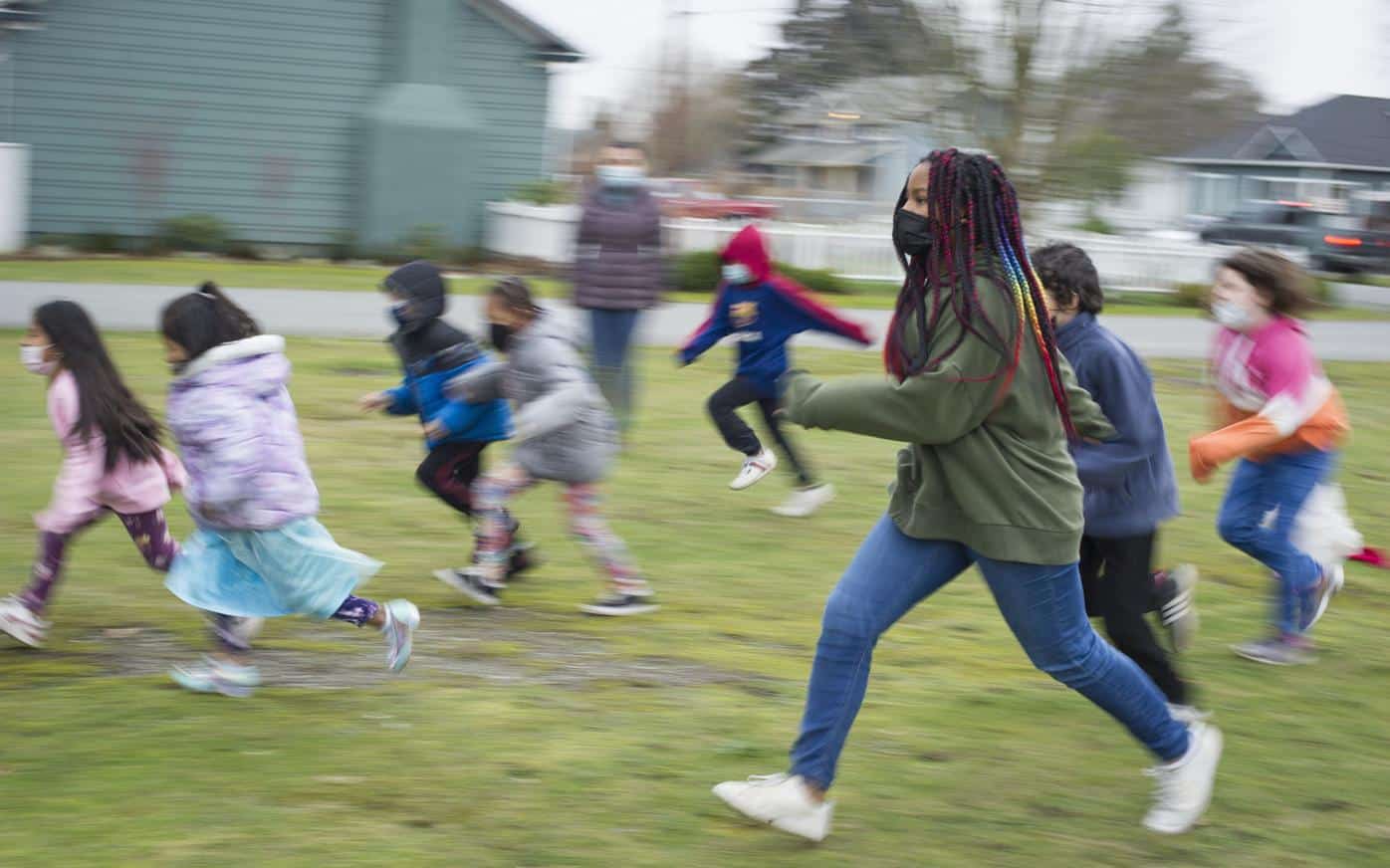 Children of the Valley site coordinator Kathy Batista prepares Monday to pick the first leader in a game of red-light green-light during free time outside at the after-school program in Sedro-Woolley.